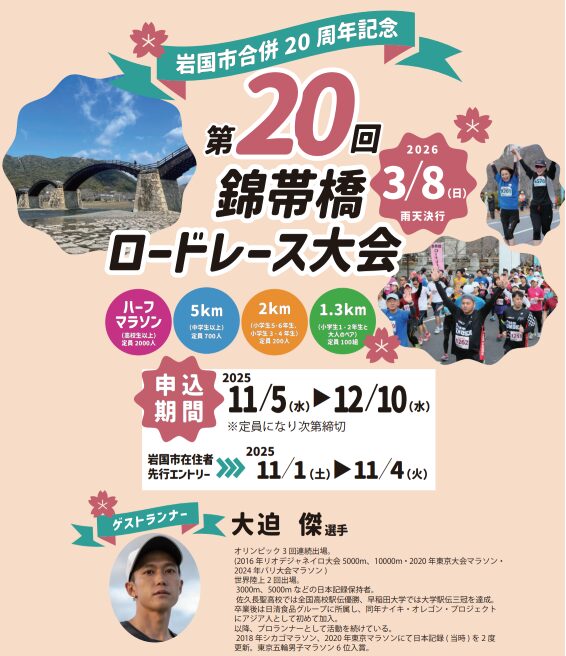 実は2026年3月8日(日)は、山口県岩国市で第20回錦帯橋ロードレース大会が行われる日なのです!