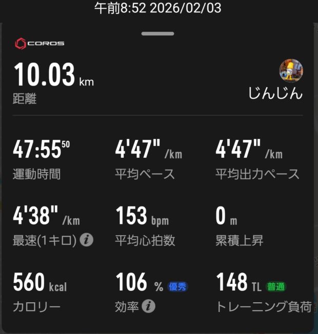 下の画像は2月3日(火)に10kmのペース走をしたときのものです。