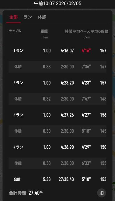 また、次の画像は2月5日(木)に1km×4本のインターバル走をしたときのものです。