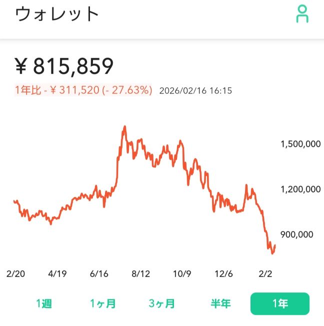 これを書いているのが2026年2月16日(月)なんですが、現時点での仮想通貨の資産額はこんな感じです。